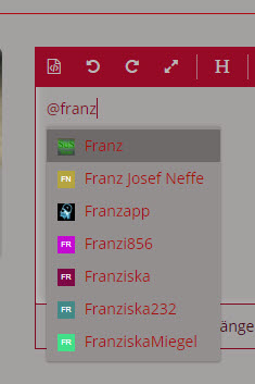 Dazu gibt man das @-Zeichen ohne Leerzeichen ein und nach 3 Buchstaben öffnet ein Popup mit Mitgliedervorschlägen: