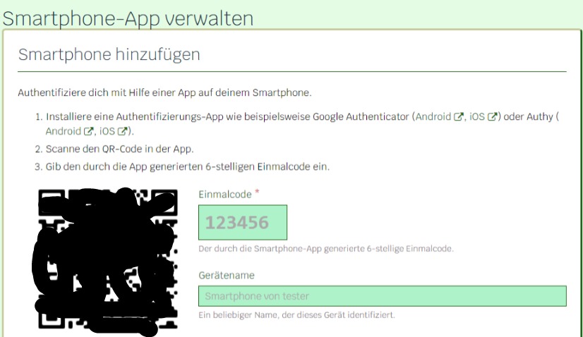 Hier muss der angezeigte QR-Code über eine Authenticator App eingescannt oder der angezeigte Code manuell in der App eingegeben werden.