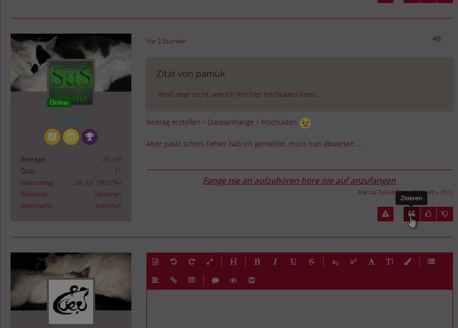 Speichert man diese Zitate, kann man die später oder gar in anderen Themen über den Editor wieder einfügen.